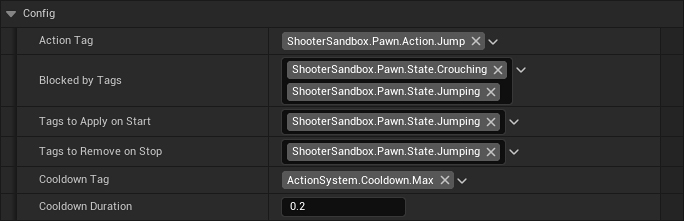 Within this plugin and the Shooter Sandbox at large, an Action is a discrete object that can contains its own logic hooks that can be triggered using Gameplay Tags. These events can be called from any Actor via the Action System Component.