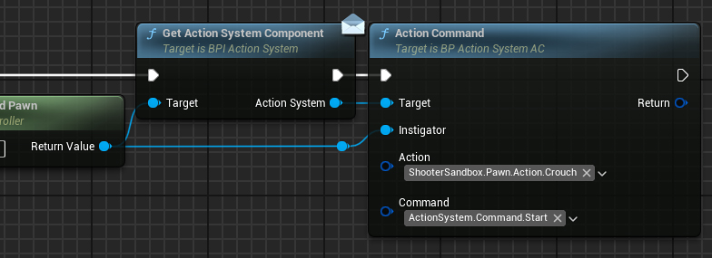 The Blueprint Interface BPI_ActionSystem can be used to quickly reach out and access an Actor’s Action System, and it’s through this Component that Action Commands can be sent. These are specific Gameplay Tags that will tell an Action what/when events should be triggered.