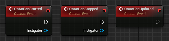 The default Action Component class has three events, OnActionStarted, OnActionStopped, and OnActionUpdated.
