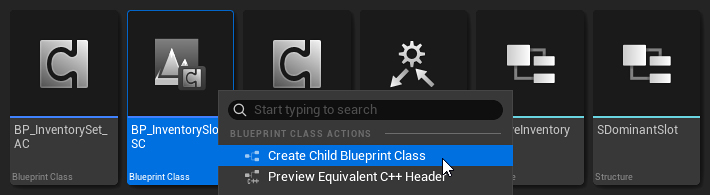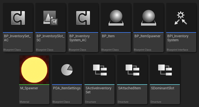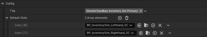 To create new Inventory Sets/Slots, you’ll need to create a child class of BP_InventorySet_AC or BP_InventorySlot_SC respectively.