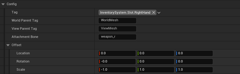 | Offset | An optional transform to offset your Inventory Slot from the Attachment Bone. This is useful to tweak the position of your Item if the animations aren’t exactly lining up. |