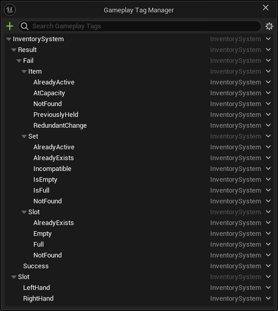 The class, InventorySystemTags, simply adds a selection of gameplay tags that are used by the system to return the result of various actions in a human-readable way.